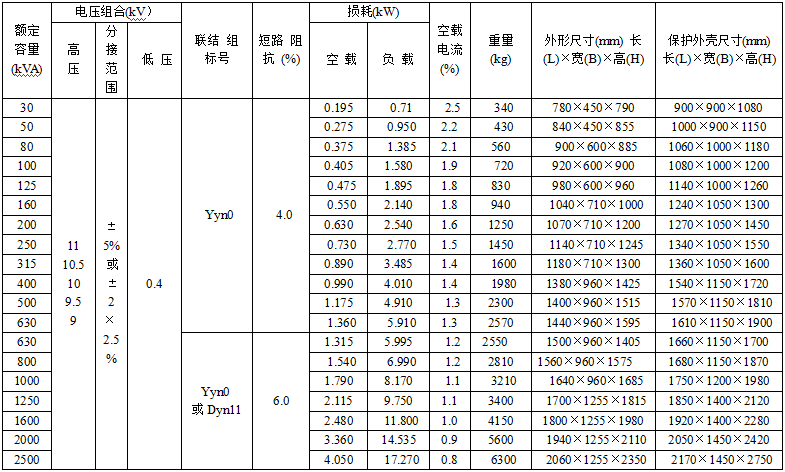 10kV級干式變壓器SCB10系列技術參數(shù)